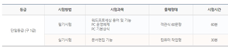 옛날에는 1급, 2급, 3급까지 급수가 나뉘어져 있었으나 현재는 단일등급(구 1급)으로 통합되어 있다. (예전의 워드 1급이 현재의 워드프로세서 단일등급이라고 보면 됨)